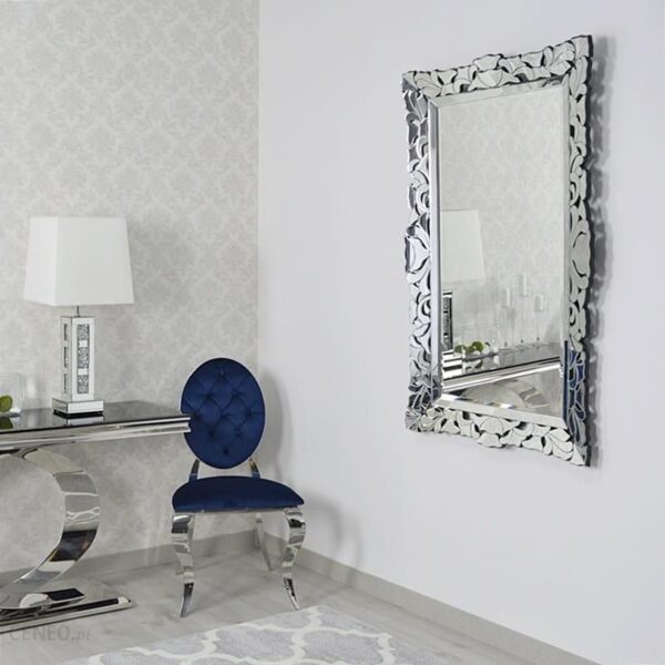 Srebrne lustro glamour prostokątne M-0519 o wymiarach 80×130 cmPiękne, dekorowane lustro w stylu glamour, przywodzące na myśl sale balowe z początków ubiegłego wieku.Piękne prostokątne lustro o dużym zwierciadle w oryginalnej ornamentowej ramie. Lustrzane elementy otaczające taflę rozświetlają pomieszczenie. Ozdobna rama wychylająca się lekko ku przodowi, filuternie zachęca do przejrzenia się w zwierciadle. Lustro z pewnością stanowić będzie niezwykle stylową dekorację w wielu aranżacjach, świetnie wkomponowując się zarówno we wnętrza w stylu klasycznym, nowoczesnym i glamour.Parametry lustra:- sposób montażu: wiszące, pion/poziom- szerokość x wysokość: 80 x 130 cm- grubość ramy: 15 mm- szerokość ramy: 13,5 cm- grubość tafli lustra: 5 mm- krawędź lustra: faza- wykończenie krawędzi lustra: mat- waga: 19 kgPo zawieszeniu lustra na ścianie rama odstaje od ściany 6,5 cm.