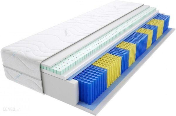 Materac jest jednostronny – jedna strona materaca nadają się do spaniaMaterac jest średniotwardyDo wyboru 6 rodzai pokrowców – 1 niepikowany, 5 pikowanychMaterac można używać w łóżkach z regulowanym stelażemMaterac jest hypoalergiczny – zminimalizowane jest ryzyku wystąpienia alergii i uczuleńSprężyny kieszeniowe Multipocket 9 stref (510szt/m2) – bezgłośna, cicha, zapewniająca najlepszy komfort snu. Wersja multipocket to dwa razy więcej sprężyn w porównaniu do zwykłej sprężyny kieszeniowej.Pianka HR – zbudowana z dużej ilości pęcherzyków, zapewnia idealne dopasowanie do ciała, bardzo dobry komfort snu i gwarantuje idealną wentylację materacaLateks – bardzo dobrze wentyluje materac, bardzo sprężysty, równomiernie podpiera ciało wpływając na właściwe krążenie krwiPianka T25 – pianka poliuretanowa otacza materac po bokach. Posiada ograniczoną odporność na wygniataniePianka wysokoelastyczna HR o gęstości 35kg/m3 – pianka ta zbudowana jest z dużej ilości pęcherzyków, zapewnia idealne dopasowanie do ciała, bardzo dobry komfort snu i gwarantuje idealną wentylację materaca. Zwiększona gęstość pianki HR wydłuża zdecydowanie trwałość materaca w porównaniu do zwykłej pianki poliuretanowej T25. Używana w naszych materacach bonellowych i kieszeniowych bezpośrednio nad i/lub pod filcem, a w materacach piankowych stanowiąca większość materaca.Sprężyny kieszeniowe MULTIPOCKET 9 stref (510szt/m2) – każda pojedyncza sprężyna umieszczona jest w materiale, tzw. kieszeni. Kieszenie są w jedną stronę zszyte ze sobą, a w drugą sklejone. W przypadku sprężyn kieszeniowych Multipocket ilość sprężyn została zwiększona do 510szt/m2 – zapewnia to prawie 2 razy więcej punktów podparcia, zwiększa jakość snu i żywotność, trwałość materaca. Materace kieszeniowe to najbardziej komfortowe materace z dostępnych na rynku. Sprężyna kieszeniowa zwana też sprężyną „cichą” zapewnia odpowiednie podparcie ciała nawet dla osób o różnej wadze. Nie występuje tutaj efekt zsuwania się osoby lżejszej na cięższą jak ma to miejsce w materacach ze sprężyną bonellową. 9 Stref twardości naszych sprężyn kieszeniowych zapewnia odpowiednie podparcie poszczególnych partii ciała osób śpiących. Twardsze sprężyny stosujemy w miejscach, w których nacisk ciała jest mniejszy jak np. lędźwie, a miększe w miejscach w których nacisk jest większy, np. biodra.Nasze materace kieszeniowe z systemem 9 strefowym zapewniają zdrowy i wygodny odpoczynek.Lateks – najlepszy, najdroższy materiał jaki można użyć do budowy materaca. Materiał, który się nie wypracowuje. Lateks poznamy po „dziurkach” w jego budowie. Specjalne mikrokanały bardzo dobrze wentylują materac, zwiększając obieg powietrza. Jest to bardzo sprężysty materiał, który równomiernie podpiera ciało, co wpływa na właściwe krążenie krwi.Pianka T25 – stosowana w materacach bonellowych i kieszeniowych po bokach materaca, czyli na powierzchni, na której nie śpimy. Gęstość pianki to 25kg/m3 – najlepszy stosunek jakości do ceny, pianka posiada ograniczoną odporność na wygniatanie.Włókno klimatyzujące nazywane też owatą to ostatnia warstwa zastosowana w budowie materaca przed pokrowcem. W przypadku pokrowców niepikowanych połączona z materacem, w pokrowcach pikowanych owata jest przepikowana z pokrowcem, a tym samym do niego przytwierdzona. Jest to materiał, który poprawia wentylację materaca oraz wzmacnia jego wytrzymałość.Filc, nazywany też przekładką tapicerską, oddziela sprężyny kieszeniowe lub bonellowe od pozostałych materiałów oraz wzmacnia wytrzymałość materaca. Zastosowanie odpowiedniej jakości filcu powoduje, że materaca nie można zrolować nie powodując uszkodzeń zastosowanych sprężynPokrowiec – każdy nasz pokrowiec posiada zamek w kształcie litery L (odsuwany jest jego krótszy i dłuższy bok)– nadaje się do ściągnięcia i prania. Po wypraniu zalecamy zakładać pokrowiec lekko wilgotny na materac – ułatwi to jego zakładanie.Do wyboru jest 6 modeli pokrowców – wszystkie informacje na temat oferowanych pokrowców można znaleźć w tym artykule: Jaki pokrowiec należy wybrać do materaca.Ważne: pokrowiec może mieć różne ułożenie napisów i znaków w zależności od jego rozmiaru. Wzór pokrowca może się nieznacznie różnić od prezentowanego na zdjęciu.