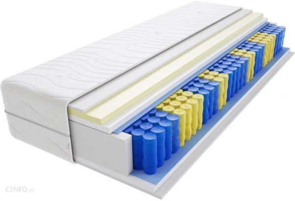 Materac jest dwustronny – obie strony materaca nadają się do spaniaMaterac jest średniotwardyDo wyboru 7 rodzai pokrowców – 1 niepikowany, 6 pikowanychMaterac można używać w łóżkach z regulowanym stelażemMaterac jest hypoalergiczny – zminimalizowane jest ryzyku wystąpienia alergii i uczuleńSprężyny kieszeniowe 9 stref (262szt/m2) – bezgłośna, cicha, zapewniająca najlepszy komfort snu. Każda sprężyna umieszczona jest w osobnej kieszeniPianka HR – zbudowana z dużej ilości pęcherzyków, zapewnia idealne dopasowanie do ciała, bardzo dobry komfort snu i gwarantuje idealną wentylację materacaPianka Visco Memory – pianka termoplastyczna, idealnie dopasowuje się do kształtu ciała. Wraz ze wzrostem temperatury staje się coraz miększaPianka T25 – pianka poliuretanowa otacza materac po bokach. Posiada ograniczoną odporność na wygniataniePianka wysokoelastyczna HR o gęstości 35kg/m3 – pianka ta zbudowana jest z dużej ilości pęcherzyków, zapewnia idealne dopasowanie do ciała, bardzo dobry komfort snu i gwarantuje idealną wentylację materaca. Zwiększona gęstość pianki HR wydłuża zdecydowanie trwałość materaca w porównaniu do zwykłej pianki poliuretanowej T25. Używana w naszych materacach bonellowych i kieszeniowych bezpośrednio nad i/lub pod filcem, a w materacach piankowych stanowiąca większość materaca.Sprężyny kieszeniowe 9 stref 262szt/m2 – każda pojedyncza sprężyna umieszczona jest w materiale, tzw. kieszeni. Kieszenie są w jedną stronę zszyte ze sobą, a w drugą sklejone. Materace kieszeniowe to najbardziej komfortowe materace z dostępnych na rynku. Sprężyna kieszeniowa zwana też sprężyną „cichą” zapewnia odpowiednie podparcie ciała nawet dla osób o różnej wadze. Nie występuje tutaj efekt zsuwania się osoby lżejszej na cięższą jak ma to miejsce w materacach ze sprężyną bonellową. 9 Stref twardości naszych sprężyn kieszeniowych zapewnia odpowiednie podparcie poszczególnych partii ciała osób śpiących. Twardsze sprężyny stosujemy w miejscach, w których nacisk ciała jest mniejszy jak np. lędźwie, a miększe w miejscach w których nacisk jest większy, np. biodra.Nasze materace kieszeniowe z systemem 9 strefowym zapewniają zdrowy i wygodny odpoczynek.Pianka termoelastyczna Visco Memory – pianka reagująca na temperaturę i nacisk. Im cieplej tym pianka staje się miększa, zmniejszanie się temperatury powoduje jej twardnienie. Pianka Visco Memory idealnie dopasowuje się do kształtu ciała , zapewnia odpowiednie podparcie kręgosłupa oraz właściwe krążenie krwi. Jej zalety docenią szczególnie osoby z dolegliwościami kręgosłupa. Pamięć (memory) pianki Visco Memory to tzw. efekt wstawania pianki Visco. Kształt pianki dopasowuje się do kształtu naszego ciała, po zmianie naszej pozycji wraca do swoich normalnych parametrów, by po chwili dopasować się do nowej pozycji przybranej przez nasze ciało podczas snu.Pianka T25 – stosowana w materacach bonellowych i kieszeniowych po bokach materaca, czyli na powierzchni, na której nie śpimy. Gęstość pianki to 25kg/m3 – najlepszy stosunek jakości do ceny, pianka posiada ograniczoną odporność na wygniatanie.Włókno klimatyzujące nazywane też owatą to ostatnia warstwa zastosowana w budowie materaca przed pokrowcem. W przypadku pokrowców niepikowanych połączona z materacem, w pokrowcach pikowanych owata jest przepikowana z pokrowcem, a tym samym do niego przytwierdzona. Jest to materiał, który poprawia wentylację materaca oraz wzmacnia jego wytrzymałość.Filc, nazywany też przekładką tapicerską, oddziela sprężyny kieszeniowe lub bonellowe od pozostałych materiałów oraz wzmacnia wytrzymałość materaca. Zastosowanie odpowiedniej jakości filcu powoduje, że materaca nie można zrolować nie powodując uszkodzeń zastosowanych sprężynPokrowiec – każdy nasz pokrowiec posiada zamek w kształcie litery L (odsuwany jest jego krótszy i dłuższy bok)- nadaje się do ściągnięcia i prania. Po wypraniu zalecamy zakładać pokrowiec lekko wilgotny na materac – ułatwi to jego zakładanie.Do wyboru jest 7 modeli pokrowców – wszystkie informacje na temat oferowanych pokrowców można znaleźć w tym artykule: Jaki pokrowiec należy wybrać do materaca.Ważne: pokrowiec może mieć różne ułożenie napisów i znaków w zależności od jego rozmiaru. Wzór pokrowca może się nieznacznie różnić od prezentowanego na zdjęciu.