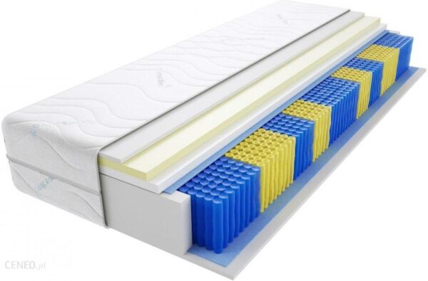 Materac jest jednostronny – jedna strona materaca nadają się do spaniaMaterac jest średniotwardyDo wyboru 6 rodzai pokrowców – 1 niepikowany, 5 pikowanychMaterac można używać w łóżkach z regulowanym stelażemMaterac jest hypoalergiczny – zminimalizowane jest ryzyku wystąpienia alergii i uczuleńSprężyny kieszeniowe Multipocket 9 stref (510szt/m2) – bezgłośna, cicha, zapewniająca najlepszy komfort snu. Wersja multipocket to dwa razy więcej sprężyn w porównaniu do zwykłej sprężyny kieszeniowej.Pianka HR – zbudowana z dużej ilości pęcherzyków, zapewnia idealne dopasowanie do ciała, bardzo dobry komfort snu i gwarantuje idealną wentylację materacaPianka Visco Memory – pianka termoplastyczna, idealnie dopasowuje się do kształtu ciała. Wraz ze wzrostem temperatury staje się coraz miększaPianka T25 – pianka poliuretanowa otacza materac po bokach. Posiada ograniczoną odporność na wygniataniePianka wysokoelastyczna HR o gęstości 35kg/m3 – pianka ta zbudowana jest z dużej ilości pęcherzyków, zapewnia idealne dopasowanie do ciała, bardzo dobry komfort snu i gwarantuje idealną wentylację materaca. Zwiększona gęstość pianki HR wydłuża zdecydowanie trwałość materaca w porównaniu do zwykłej pianki poliuretanowej T25. Używana w naszych materacach bonellowych i kieszeniowych bezpośrednio nad i/lub pod filcem, a w materacach piankowych stanowiąca większość materaca.Sprężyny kieszeniowe MULTIPOCKET 9 stref (510szt/m2) – każda pojedyncza sprężyna umieszczona jest w materiale, tzw. kieszeni. Kieszenie są w jedną stronę zszyte ze sobą, a w drugą sklejone. W przypadku sprężyn kieszeniowych Multipocket ilość sprężyn została zwiększona do 510szt/m2 – zapewnia to prawie 2 razy więcej punktów podparcia, zwiększa jakość snu i żywotność, trwałość materaca. Materace kieszeniowe to najbardziej komfortowe materace z dostępnych na rynku. Sprężyna kieszeniowa zwana też sprężyną „cichą” zapewnia odpowiednie podparcie ciała nawet dla osób o różnej wadze. Nie występuje tutaj efekt zsuwania się osoby lżejszej na cięższą jak ma to miejsce w materacach ze sprężyną bonellową. 9 Stref twardości naszych sprężyn kieszeniowych zapewnia odpowiednie podparcie poszczególnych partii ciała osób śpiących. Twardsze sprężyny stosujemy w miejscach, w których nacisk ciała jest mniejszy jak np. lędźwie, a miększe w miejscach w których nacisk jest większy, np. biodra.Nasze materace kieszeniowe z systemem 9 strefowym zapewniają zdrowy i wygodny odpoczynek.Pianka termoelastyczna Visco Memory – pianka reagująca na temperaturę i nacisk. Im cieplej tym pianka staje się miększa, zmniejszanie się temperatury powoduje jej twardnienie. Pianka Visco Memory idealnie dopasowuje się do kształtu ciała , zapewnia odpowiednie podparcie kręgosłupa oraz właściwe krążenie krwi. Jej zalety docenią szczególnie osoby z dolegliwościami kręgosłupa. Pamięć (memory) pianki Visco Memory to tzw. efekt wstawania pianki Visco. Kształt pianki dopasowuje się do kształtu naszego ciała, po zmianie naszej pozycji wraca do swoich normalnych parametrów, by po chwili dopasować się do nowej pozycji przybranej przez nasze ciało podczas snu.Pianka T25 – stosowana w materacach bonellowych i kieszeniowych po bokach materaca, czyli na powierzchni, na której nie śpimy. Gęstość pianki to 25kg/m3 – najlepszy stosunek jakości do ceny, pianka posiada ograniczoną odporność na wygniatanie.Włókno klimatyzujące nazywane też owatą to ostatnia warstwa zastosowana w budowie materaca przed pokrowcem. W przypadku pokrowców niepikowanych połączona z materacem, w pokrowcach pikowanych owata jest przepikowana z pokrowcem, a tym samym do niego przytwierdzona. Jest to materiał, który poprawia wentylację materaca oraz wzmacnia jego wytrzymałość.Filc, nazywany też przekładką tapicerską, oddziela sprężyny kieszeniowe lub bonellowe od pozostałych materiałów oraz wzmacnia wytrzymałość materaca. Zastosowanie odpowiedniej jakości filcu powoduje, że materaca nie można zrolować nie powodując uszkodzeń zastosowanych sprężynPokrowiec – każdy nasz pokrowiec posiada zamek w kształcie litery L (odsuwany jest jego krótszy i dłuższy bok)– nadaje się do ściągnięcia i prania. Po wypraniu zalecamy zakładać pokrowiec lekko wilgotny na materac – ułatwi to jego zakładanie.Do wyboru jest 6 modeli pokrowców – wszystkie informacje na temat oferowanych pokrowców można znaleźć w tym artykule: Jaki pokrowiec należy wybrać do materaca.Ważne: pokrowiec może mieć różne ułożenie napisów i znaków w zależności od jego rozmiaru. Wzór pokrowca może się nieznacznie różnić od prezentowanego na zdjęciu.