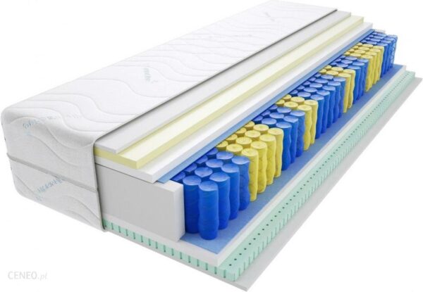 Materac jest dwustronny – obie strony materaca nadają się do spaniaObie strony materaca są średniotwardeDo wyboru 6 rodzai pokrowców – 1 niepikowany, 5 pikowanychMaterac można używać w łóżkach z regulowanym stelażemMaterac jest hypoalergiczny – zminimalizowane jest ryzyku wystąpienia alergii i uczuleńSprężyny kieszeniowe 9 stref (262szt/m2) – bezgłośna, cicha, zapewniająca najlepszy komfort snu. Każda sprężyna umieszczona jest w osobnej kieszeniPianka HR – zbudowana z dużej ilości pęcherzyków, zapewnia idealne dopasowanie do ciała, bardzo dobry komfort snu i gwarantuje idealną wentylację materacaLateks – bardzo dobrze wentyluje materac, bardzo sprężysty, równomiernie podpiera ciało wpływając na właściwe krążenie krwiPianka Visco Memory – pianka termoplastyczna, idealnie dopasowuje się do kształtu ciała. Wraz ze wzrostem temperatury staje się coraz miększaPianka T25 – pianka poliuretanowa otacza materac po bokach. Posiada ograniczoną odporność na wygniataniePianka wysokoelastyczna HR o gęstości 35kg/m3 – pianka ta zbudowana jest z dużej ilości pęcherzyków, zapewnia idealne dopasowanie do ciała, bardzo dobry komfort snu i gwarantuje idealną wentylację materaca. Zwiększona gęstość pianki HR wydłuża zdecydowanie trwałość materaca w porównaniu do zwykłej pianki poliuretanowej T25. Używana w naszych materacach bonellowych i kieszeniowych bezpośrednio nad i/lub pod filcem, a w materacach piankowych stanowiąca większość materaca.Sprężyny kieszeniowe 9 stref 262szt/m2 – każda pojedyncza sprężyna umieszczona jest w materiale, tzw. kieszeni. Kieszenie są w jedną stronę zszyte ze sobą, a w drugą sklejone. Materace kieszeniowe to najbardziej komfortowe materace z dostępnych na rynku. Sprężyna kieszeniowa zwana też sprężyną „cichą” zapewnia odpowiednie podparcie ciała nawet dla osób o różnej wadze. Nie występuje tutaj efekt zsuwania się osoby lżejszej na cięższą jak ma to miejsce w materacach ze sprężyną bonellową. 9 Stref twardości naszych sprężyn kieszeniowych zapewnia odpowiednie podparcie poszczególnych partii ciała osób śpiących. Twardsze sprężyny stosujemy w miejscach, w których nacisk ciała jest mniejszy jak np. lędźwie, a miększe w miejscach w których nacisk jest większy, np. biodra.Nasze materace kieszeniowe z systemem 9 strefowym zapewniają zdrowy i wygodny odpoczynek.Lateks – najlepszy, najdroższy materiał jaki można użyć do budowy materaca. Materiał, który się nie wypracowuje. Lateks poznamy po „dziurkach” w jego budowie. Specjalne mikrokanały bardzo dobrze wentylują materac, zwiększając obieg powietrza. Jest to bardzo sprężysty materiał, który równomiernie podpiera ciało, co wpływa na właściwe krążenie krwi.Pianka termoelastyczna Visco Memory – pianka reagująca na temperaturę i nacisk. Im cieplej tym pianka staje się miększa, zmniejszanie się temperatury powoduje jej twardnienie. Pianka Visco Memory idealnie dopasowuje się do kształtu ciała , zapewnia odpowiednie podparcie kręgosłupa oraz właściwe krążenie krwi. Jej zalety docenią szczególnie osoby z dolegliwościami kręgosłupa. Pamięć (memory) pianki Visco Memory to tzw. efekt wstawania pianki Visco. Kształt pianki dopasowuje się do kształtu naszego ciała, po zmianie naszej pozycji wraca do swoich normalnych parametrów, by po chwili dopasować się do nowej pozycji przybranej przez nasze ciało podczas snu.Pianka T25 – stosowana w materacach bonellowych i kieszeniowych po bokach materaca, czyli na powierzchni, na której nie śpimy. Gęstość pianki to 25kg/m3 – najlepszy stosunek jakości do ceny, pianka posiada ograniczoną odporność na wygniatanie.Włókno klimatyzujące nazywane też owatą to ostatnia warstwa zastosowana w budowie materaca przed pokrowcem. W przypadku pokrowców niepikowanych połączona z materacem, w pokrowcach pikowanych owata jest przepikowana z pokrowcem, a tym samym do niego przytwierdzona. Jest to materiał, który poprawia wentylację materaca oraz wzmacnia jego wytrzymałość.Filc, nazywany też przekładką tapicerską, oddziela sprężyny kieszeniowe lub bonellowe od pozostałych materiałów oraz wzmacnia wytrzymałość materaca. Zastosowanie odpowiedniej jakości filcu powoduje, że materaca nie można zrolować nie powodując uszkodzeń zastosowanych sprężynPokrowiec – każdy nasz pokrowiec posiada zamek w kształcie litery L (odsuwany jest jego krótszy i dłuższy bok)– nadaje się do ściągnięcia i prania. Po wypraniu zalecamy zakładać pokrowiec lekko wilgotny na materac – ułatwi to jego zakładanie.Do wyboru jest 6 modeli pokrowców – wszystkie informacje na temat oferowanych pokrowców można znaleźć w tym artykule: Jaki pokrowiec należy wybrać do materaca.Ważne: pokrowiec może mieć różne ułożenie napisów i znaków w zależności od jego rozmiaru. Wzór pokrowca może się nieznacznie różnić od prezentowanego na zdjęciu.