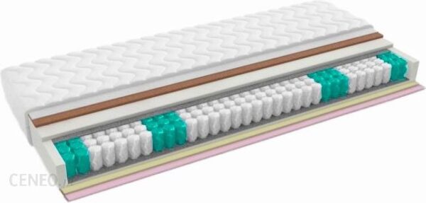 Budowa materaca:pokrowiec wykonany jest z materiału antyalergicznego niepikowanego, ma wszyty zamek w kształcie litery L – ułatwia to wygodne ściąganie i pranie;materac wykonany jest z wysokiej jakości pianki poliuretanowej;zastosowana przekładka tapicerska wzmacnia wytrzymałość materaca, izoluje formatkę sprężynową od pianki;zastosowany lateks zwiększa komfort spania, materac jest bardziej miękki i sprężysty. Specjalne kanaliki zapewniają doskonałą cyrkulację powietrza;zastosowana matakokosowa podnosi jakość snu, twardość, wytrzymałość i wentylacje materaca. Posiada właściwości antyalergiczne i antygrzybiczne;sprężyny kieszeniowe są umieszczone każda w osobnej kieszonce (ponad 260szt/m2);zastosowany podwójny system klejenia zwiększa jakość i przedłuża żywotność materaca;zastosowana pianka termoelastyczna (visco) reaguje na nacisk i temperaturę. Doskonale dopasowuje się do kształtu ciała, dzięki temu kręgosłup może przybrać naturalną pozycję;w materacu zostały zastosowane obustronnie włókna klimatyzujące 150g/1m;wysokość materaca 22cm.Opis materaca:Sprężyny kieszeniowe zapewniają elastyczność punktową co oznacza, że doskonale dopasowują się do kształtu ciała. Materac posiada 9 stref twardości czyli umieszczone są sprężyny kieszeniowe 9 strefowe, każda w osobnej kieszonce, dzięki temu nie słyszymy odgłosów pracy sprężyn. Elastyczność punktowa sprawia, że nie odczuwamy różnicy wagi partnerów oraz wiercenia czy obracania się. Dodatkowo zastosowana pianka termoelastyczna (visco) jest atutem materaca. Dzięki tej piance elastyczność będzie zmieniana pod wpływem temperatury. Doskonale dopasowuje się do kształtu ciała, dzięki temu kręgosłup może przybrać naturalną pozycję.Pianka visco posiada właściwości przeciwodleżynowe co pozwoli zmniejszyć problemy z kręgosłupem. Dodatkowo zastosowany lateks jest atutem materaca. Materac zapewnia zwiększony komfort snu i doskonałą cyrkulację powietrza. Pianka lateksowa jest trwała i elastyczna oraz posiada właściwości antybakteryjne oraz antygrzybiczne. Zastosowana mata kokosowa poprawia wentylacje materaca co zmniejsza nadmierne pocenie. Posiada właściwości antyalergiczne oraz antygrzybiczne.Przedłuża to żywotność materaca i zwiększa twardość. Materac posiada dwie strony o różnych twardościach. Od strony maty kokosowej – warstwa średnio twarda (H3). Od strony pianki lateksowej i pianki visco – warstwa miękka (H2).Charakterystyka materaca:materac posiada 9 stref twardości dzięki temu doskonale dopasowuje się do kształtu ciała;materac jest dwustronny, dlatego obie powierzchnie są przeznaczoną do użytkowania;materac należy do materacy hypoalergicznych, co zmniejsza ryzyko wystąpienia uczulenia, alergii;zastosowana została pianka poliuretanowa T25 o podwyższonej wytrzymałości i elastyczności;zastosowana pianka visco pozwala materacowi zmieniać twardość w zależności od temperatury. Doskonale dopasowuje się do kształtu ciała, dzięki temu kręgosłup może przybrać naturalną pozycję oraz redukuje bóle związane z kręgosłupem. Zapobiega powstawaniu odleżyn. Materac z tą pianką to gwarancja najwyższego komfortu snu;kokos to naturalny produkt, tworzony z ze skorup orzecha kokosowego. Włókna kokosowe łączy się za pomocą elastycznego lateksu. Polepsza to cyrkulacje powietrza. Posiada właściwości antyalergiczne i antygrzybiczne. Materace są twardsze i odporne na odkształcenia;zastosowany lateks poprawia komfort spania, jest trwały i elastyczny, dopasowany do kształtu ciała. Posiada właściwości antybakteryjne oraz antygrzybiczne.sprężyny kieszeniowe (ponad 260szt/m2) zapewniają elastyczność punktową;pokrowiec z zamkiem ułatwia ściąganie go i pranie (40stopni C);materac przeznaczony jest także do łóżek z regulowanym stelażem;od strony maty kokosowej – warstwa średnio twarda (H3);od strony pianki lateksowej i pianki visco – warstwa miękka (H2);materac należy do kategorii materacy miękkich i średnio twardych.