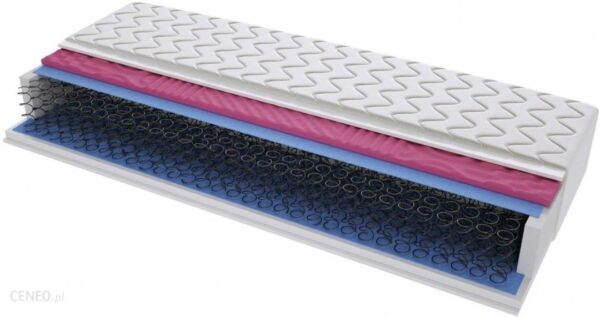 Wszystkie nasze materace posiadają antyalergiczny pokrowiec niepikowany z zamkiem w kształcie litery L. Zastosowano obustronnie włókno klimatyzujące 150g/1m.Sprężyny bonellowe – wykonane z wysokiej jakości drutu, charakteryzuje się trwałością oraz sprężystością progresywną.Budowa materaca pozwala na używanie go w łóżkach z regulowanym stelażem.Materac dwustronny – obie strony materaca stanowią powierzchnię użytkową.Materac jest hypoalergiczny z racji tego zminimalizowane jest ryzyko wystąpienia uczulenia, alergii.Wysokiej jakości pianka poliuretanowa T25 o podwyższonej wytrzymałości i elastyczności.Siedmio strefowa pianka profilowana moletowanaMaterac jest średniotwardy.Pokrowiec posiada zamek co ułatwia ściągnięcie go i wypranie (temp. 40 stopni Celcjusza)Podwójny system klejenia pozwala zwiększyć jakość, ale również przedłużyć żywotność materaca.Pokrowiec niepikowany – materiał hipoalergiczny, antyuczuleniowy, wyposażony w zamek w kształcie litery L. Pokrowiec można łatwo ściągnąć i wyprać (zalecane pranie min. raz na pół roku). Delikatny, przyjemny, wysoka jakość oraz gramatura dzianiny pokrowca sprawia, że jest on zaraz wytrzymały jak i przyjemny i delikatny w codziennym użytkowaniu.Profilowana pianka moletowana – pianka ta posiada szereg następujących po sobie wgłębień i wypustek co składa się na 7 strefowe profilowanie materaca. Pianka ta znacząco poprawia wentylację materaca. Idealnie dopasowuje się do kształtu ciała. Posiada dużą gęstość, zapewnia bardzo dobrą odporność na odkształcenia oraz poprawia krążenie krwi i posiada właściwości masujące.Pianka T25 – wysokiej jakości pianka poliuretanowa otaczająca materac z góry oraz po bokach zapewnia właściwe krążenie krwi, anatomiczne dopasowanie się materaca do kształtu ciała. Wzmacnia poczucie komfortu i wygody użytkowania.Przekładka tapicerska – wzmacnia wytrzymałość materaca, izoluje formatkę sprężynową od piankiWłókno klimatyzujące, owata (150g/1m) – zapewnia odpowiednią wentylację materaca, wzmacnia jego wytrzymałość – w pokrowcu pikowanym połączona z pokrowcem, co skutecznie uniemożliwia jego pranie w pralce. W pokrowcu niepikowanym jest częścią wewnętrzną materaca, nie połączone z pokrowcem, pozwala na pranie pokrowca w pralce.Sprężyny bonellowe – sprężyne te cechuje tzw. elastyczność powierzchniowa. O co chodzi? Im większy jest nacisk na materac tym większy jest opór powierzchni sprężyn. Im mniejszy nacisk tym opór maleje. Dzieki temu materac zbudowny ze sprężyn bonellowych jest bardzo elastyczny i uniwersalny. Nadaje się dla osób w dużym przediale wagowym. Tak zbudowany materac można polecić osobom ceniącym sobie jego wygodę użytkownia, uniwesrsalność w stosunku do bardzo korzystnej ceny.