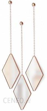 Lustra Umbra Dima Diamond holenderskiej marki Umbra. W komplecie znajdują się 3 lusterka w kształcie diamentów oraz zestaw do montażu na ścianie, będący sam w sobie dekoracją. Lusterka wiszą na estetycznym, okrągłym kołku i łańcuszku. Delikatny design luster Dima doskonale sprawdza się przy wejściu do domu, w damskiej toaletce, sypialni lub na ścianie ze zdjęciami.Materiał: stal, szkło lustrzaneKolor: miedzianyRozmiar: 29 x 17 x 4 cmWaga: 1 kgProjekt: Sung Wook